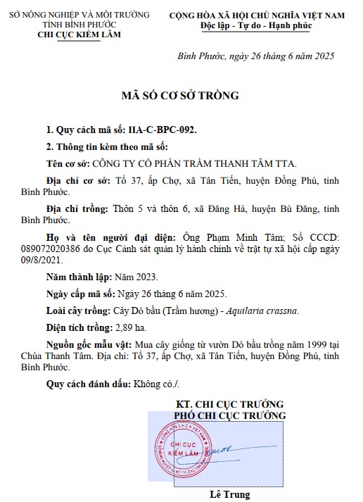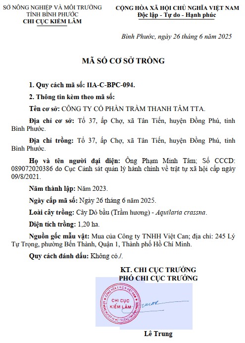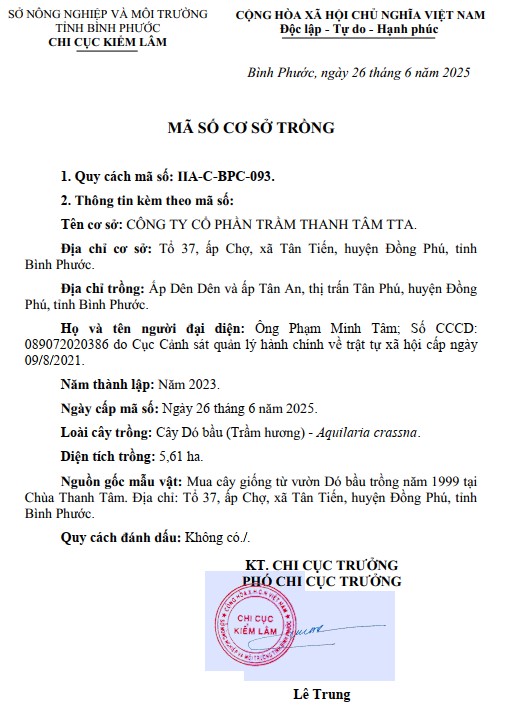 Ngày 26/6/2025, Chi cục Kiểm lâm – Sở Nông nghiệp và Môi trường tỉnh Bình Phước đã ban hành quyết định cấp 3 mã số cơ sở trồng cây Dó bầu (trầm hương – Aquilaria crassna) cho Công ty Cổ phần Trầm Thanh Tâm (TTA). Đây là bước tiến pháp lý quan trọng, minh chứng cho hệ thống vùng nguyên liệu của doanh nghiệp được xây dựng bài bản, rõ ràng và tuân thủ nghiêm ngặt quy định của Nhà nước.
