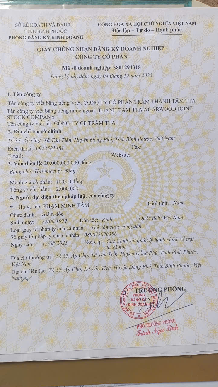 Trầm Thanh Tâm TTA được thành lập với mã số doanh nghiệp 3801294318, được cấp bởi Phòng Đăng ký Kinh doanh – Sở Tài chính tỉnh Bình Phước. Ngành nghề kinh doanh được đăng ký đầy đủ, từ trồng cây dó bầu, sản xuất tinh dầu, nhang trầm, mỹ nghệ từ trầm, bán buôn nguyên liệu trầm hương, đến kinh doanh du lịch sinh thái và bất động sản – phản ánh tầm nhìn phát triển hệ sinh thái đa ngành, liên kết chặt chẽ từ nông nghiệp đến thương mại dịch vụ.