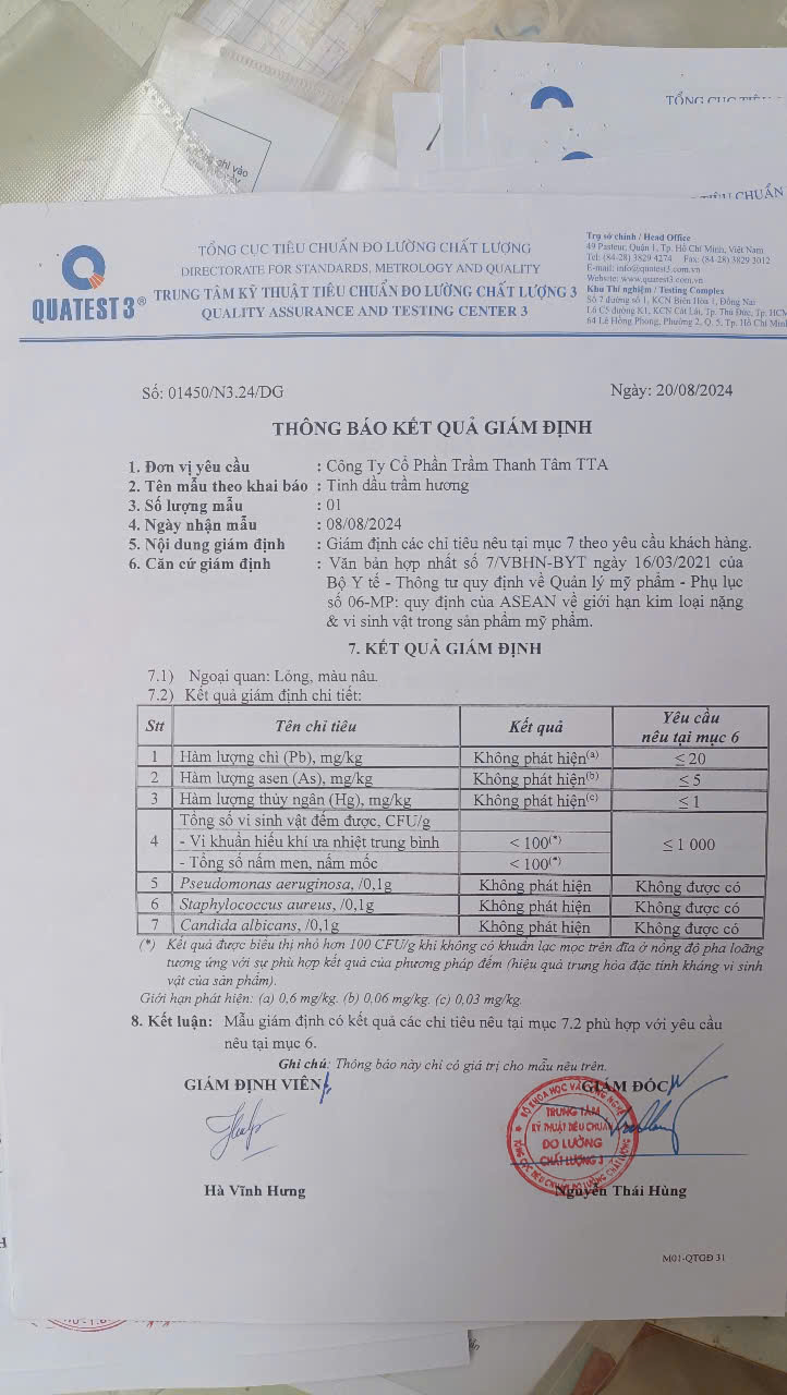 Một trong những minh chứng rõ ràng nhất về cam kết chất lượng của Trầm Hương TTA chính là kết quả kiểm định tinh dầu trầm tại Trung tâm Kỹ thuật Tiêu chuẩn Đo lường Chất lượng 3 (QUATEST 3).