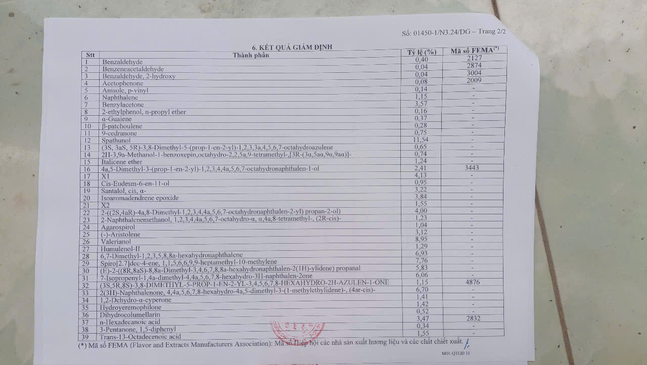 Theo báo cáo ngày 20/08/2024, mẫu tinh dầu được kiểm tra cho thấy: